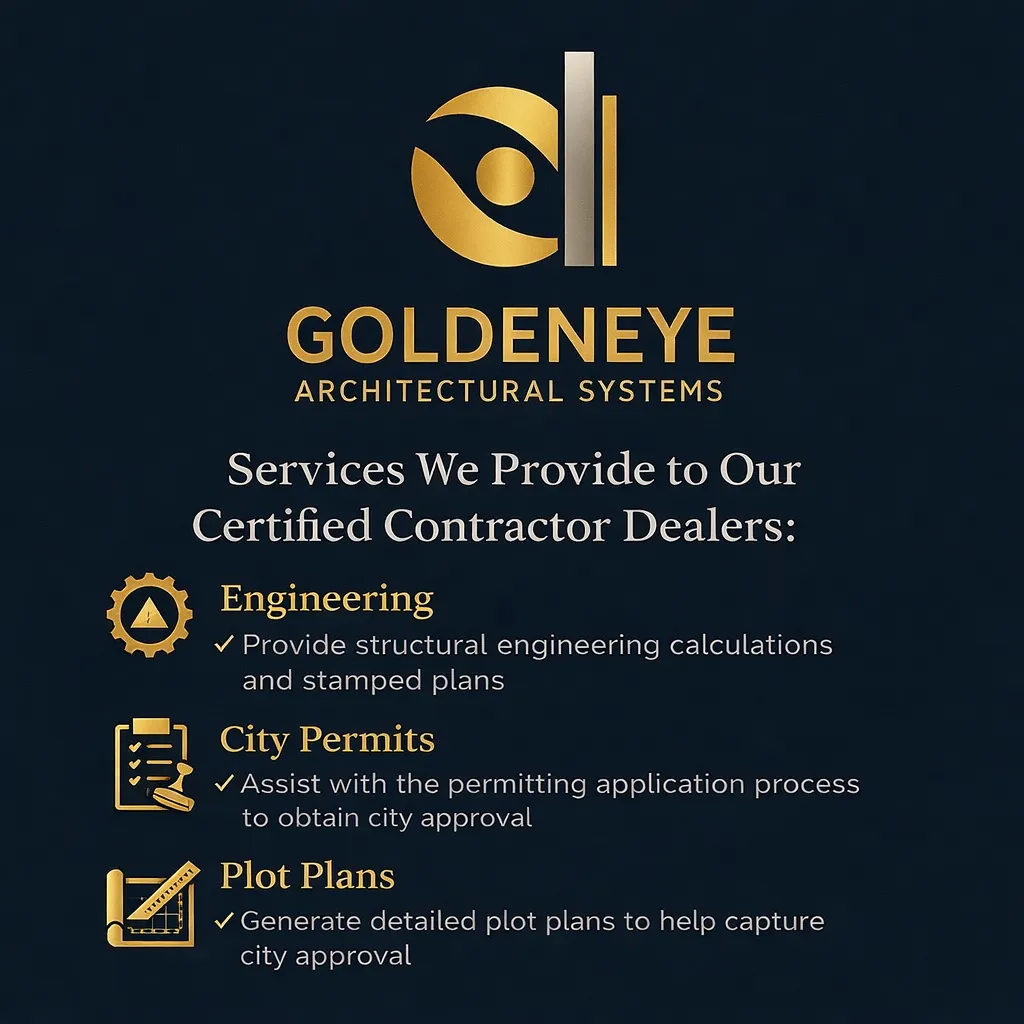 Join the GoldenEye Architectural Systems Dealers and gain access to premium aluminum materials, components, and contractor-only pricing. Our certified dealers receive priority support, exclusive product access, and the ability to order directly through our dealer portal.