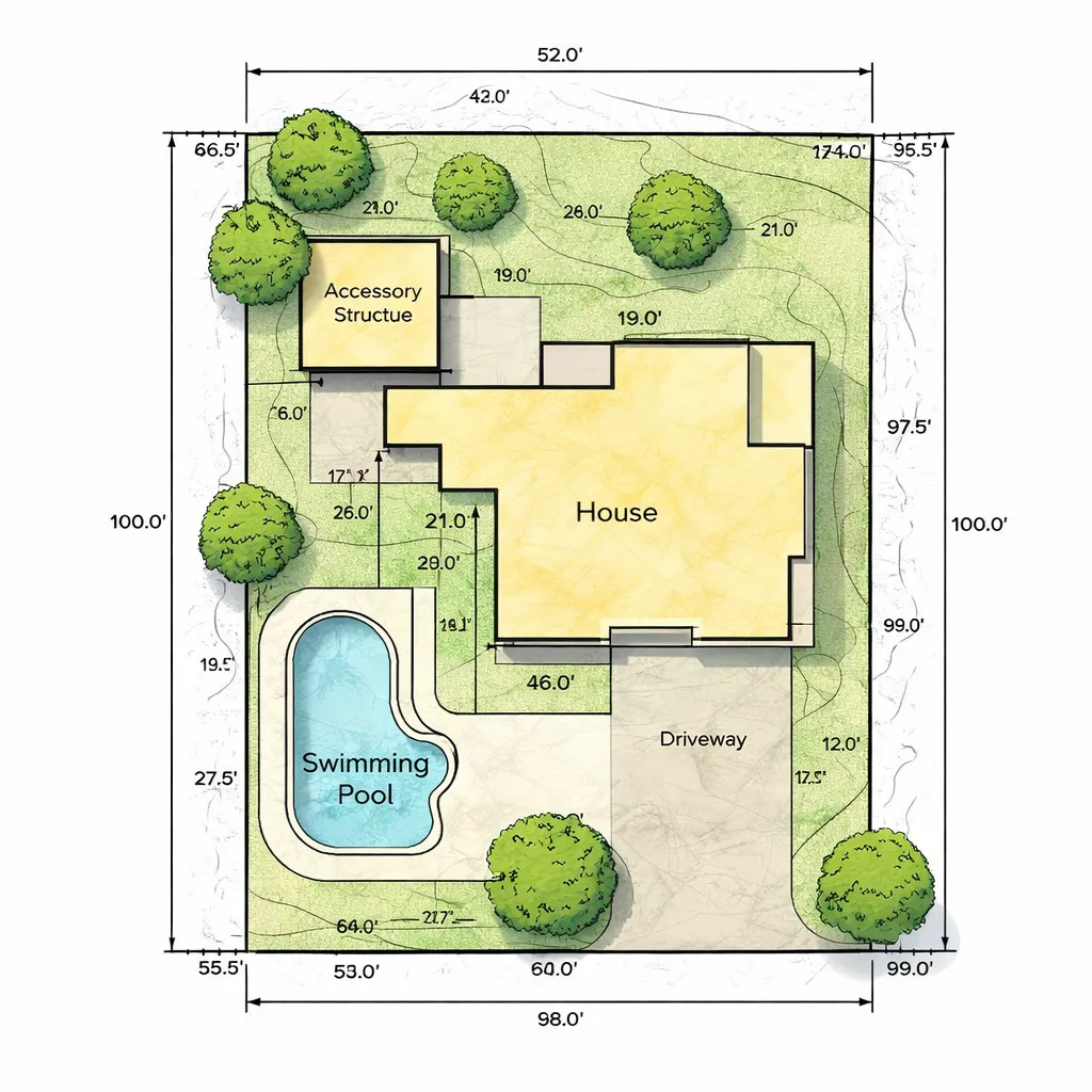 This plan includes all features of the Basic Site Plan, in addition to precise measurements between site features, existing trees, driveway configuration, accessory structure roofline details, and swimming pool location.